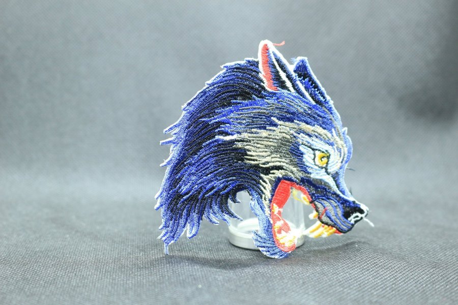 Ett detaljerat broderat märke föreställande ett varghuvud. Märket har en dynamisk design med nyanser av blått, svart, vitt, rött och gult, vilket ger det ett levande uttryck. Perfekt för att personifiera kläder eller accessoarer.