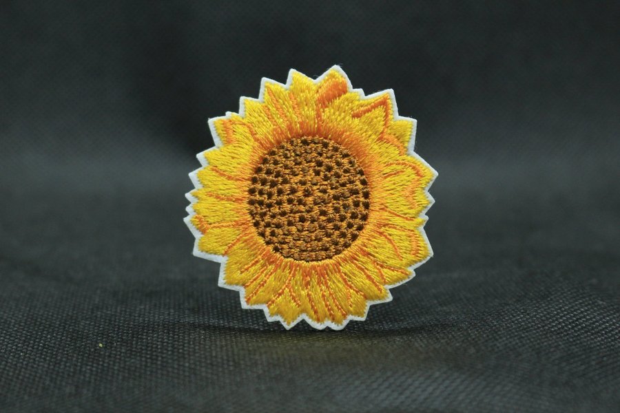 Ett broderat märke i form av en solros. Märket har en gul krona och en brun mitt.