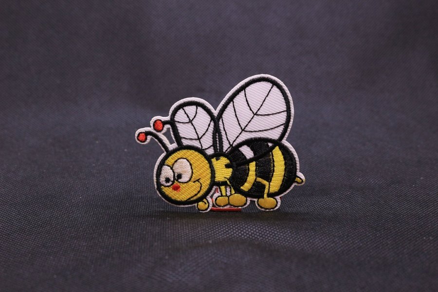 Broderad applikation i form av ett sött bi med stora vingar och ett leende ansikte. Perfekt för att dekorera kläder eller accessoarer.