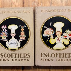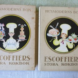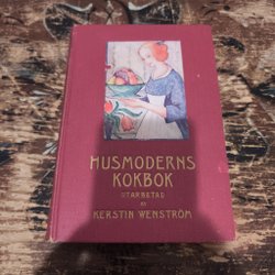 En äldre upplaga av Husmoderns Kokbok. Innehåller recept och matsedlar och charmiga gamla annonser.