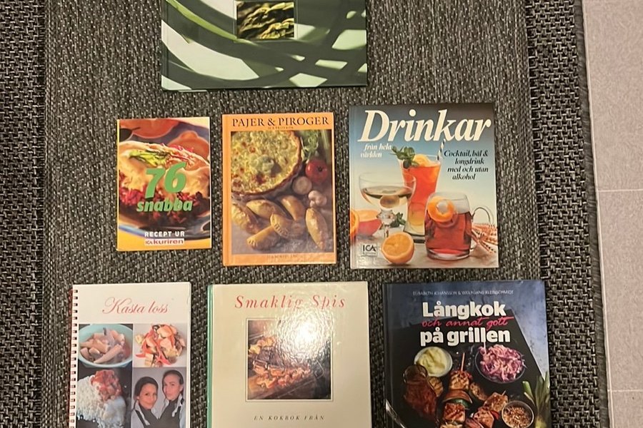 Samling av kokböcker med varierande teman: Grön Gastronomi, 76 Snabba recept ur icakuriren, Pajer & Piroger, Drinkar från hela världen, Kasta Loss, Smaklig Spis från Bosch, och Långkok och annat gott på grillen.