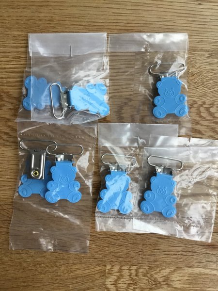 Här är fem stycken blå napphållare med nallemotiv i metall. Varje napphållare är förpackad separat i en plastpåse.
