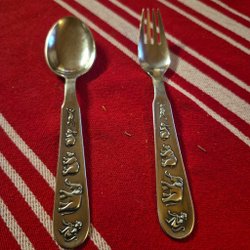 Enligt Google Gense djungel bestick med motiv av djur. Kan jag inte bekräfta. Nysilver. Välanvända.