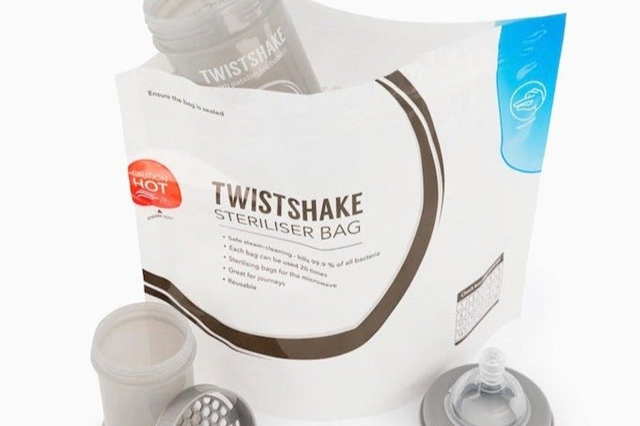 Twistshake steriliseringspåsar är ett snabbt och effektivt sätt att rengöra dina babyprodukter. Vare sig det är nappflaskor, nappar, bröstpumpar, bitringar eller bröstvårtsskydd, steriliserar våra steriliseringspåsar dem på tre minuter. Lägg bara babyprodukterna som ska rengöras i en av våra påsar och lägg den i mikrovågsugnen. Med ångrengöring dödas 99 % av de mest vanligt förekommande bakterierna för att säkerställa att din baby är säker och frisk. Twistshakes steriliseringspåsar kommer i ett fempack. Varje påse kan användas upp till 20 gånger innan de måste kasseras. Med andra ord ger ett paket dig 100 chanser att rengöra och upprätthålla hygienen på dina babyprodukter. Våra steriliseringspåsar är särskilt smidiga när du reser. Att hålla din baby frisk och säker har aldrig varit enklare.