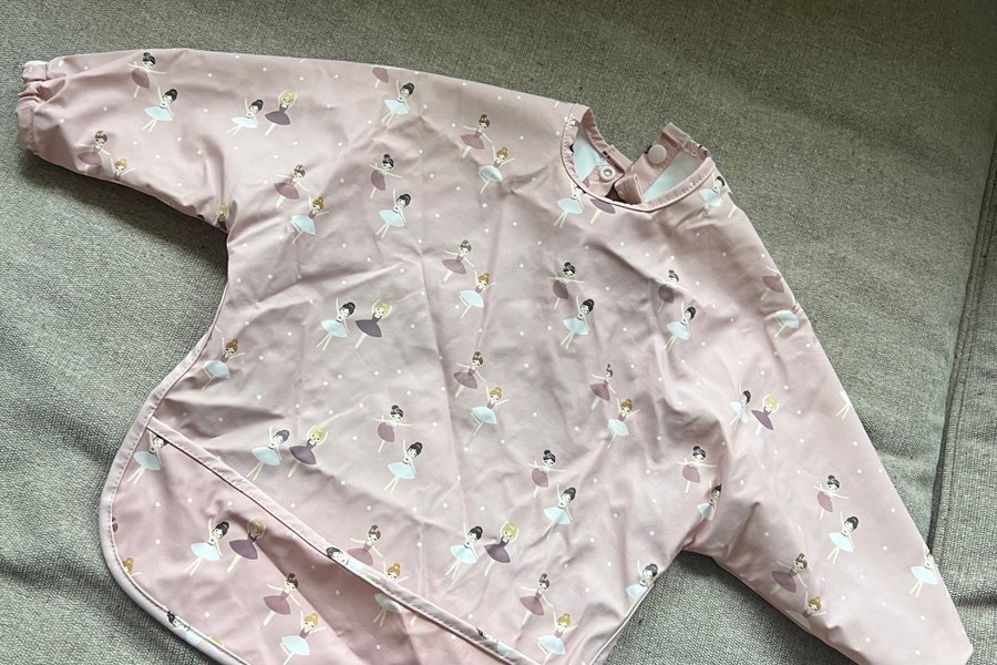 En rosa långärmad haklapp med ett mönster av balettdansöser. Haklappen har en ficka framtill för att fånga upp matrester och knäpps i nacken med tryckknappar.