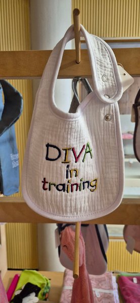 Vit haklapp med texten "DIVA in training" maskin broderad i olika färger. Haklappen har tryckknappar för enkel stängning.