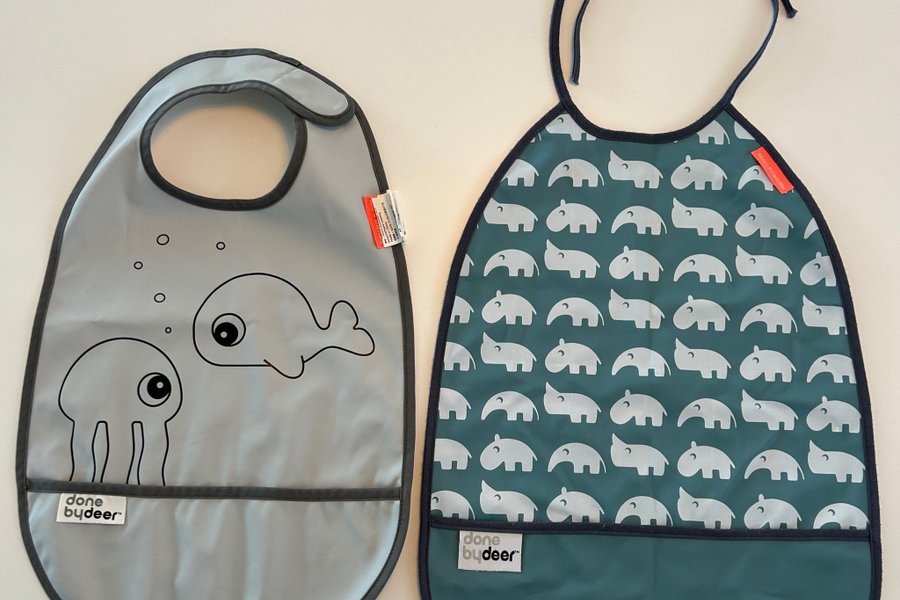 Två haklappar från Done by Deer. Den ena är ljusgrå med motiv av en manet och en val, och den andra är mörkgrön med ett mönster av elefanter. Båda haklapparna har en ficka nedtill för att fånga upp matrester.