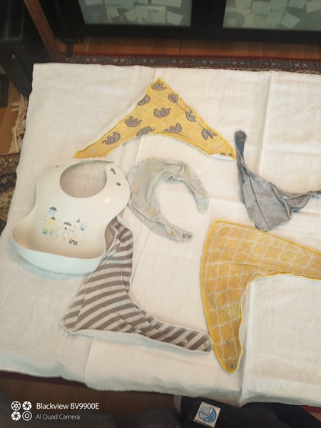 En haklapp i plast samt ett set med olika dregglisar i olika mönster och färger. De tygbaserade haklapparna har tryckknappar för enkel justering.