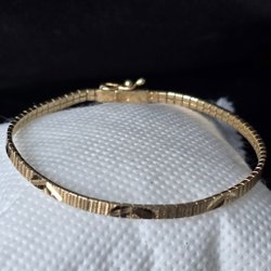 Ett vintage ormarmband med detaljerade ormhuvuden och dekorativa mönster längs bandet. Armbandet har ett spänne för enkel öppning och stängning. Märkt med ett "S" i en romb.