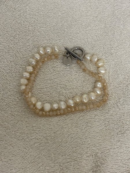 Ett vackert armband med pärlor och små ljusa stenar. Armbandet har ett silverfärgat spänne.