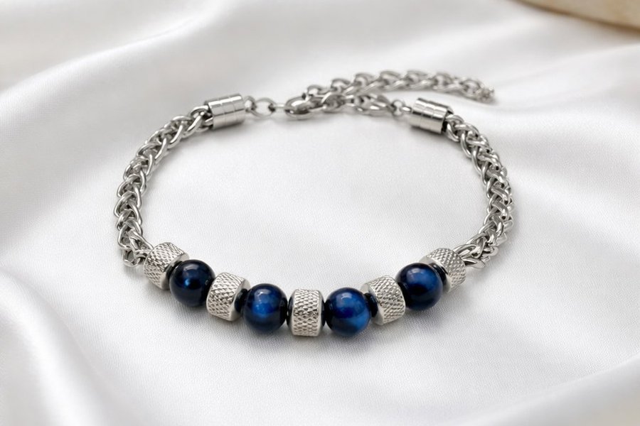 Ett exklusivt armband som förenar naturens mystik med modern hantverksskicklighet. Tre djupblå tigerögapärlor med hypnotiserande chatoyanta band är varsamt infattade mellan texturerade pärlor i rostfritt stål, allt sammanlänkat med en robust kedja i rostfritt stål. Den justerbara längden (20cm + 4cm förlängning) och säkra karabinlåset gör detta armband perfekt för både vardag och fest.