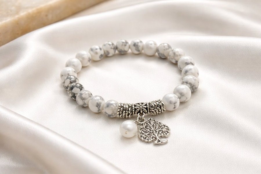 Howlite sägs vara en kraftfull sten för kronchakrat. Den främjar lugn, tålamod och emotionell healing. Bär detta armband för att omfamna howlites lugnande energi och livets träds påminnelse om din inre styrka och tillväxt.