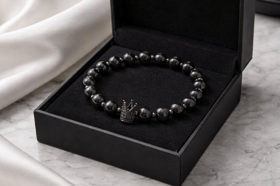 Svart onyx sägs vara en kraftfull sten för rotchakrat. Den främjar jordning, emotionell styrka och skydd mot negativ energi. Bär detta armband för att omfamna onyxens stärkande energi och kronans påminnelse om din personliga makt.