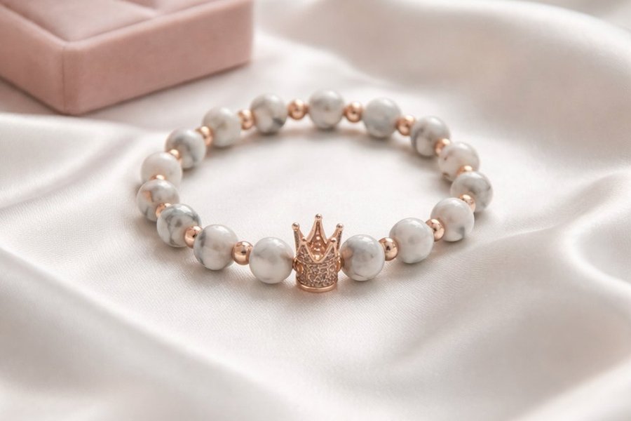 Möt Althea – ett raffinerat armband med äkta howlite som utstrålar lugn, värdighet och kunglig elegans. De vackra howlitekulorna i mjuka vita och grå marmorerade toner påminner om naturens lugn och är varsamt separerade med roséguldpläterade mellanpärlor som skapar en lyxig kontrast. Armbandet pryds av en detaljerad kronberlock i roséguld – en kraftfull symbol för personlig makt, självkärlek och din inre drottning.