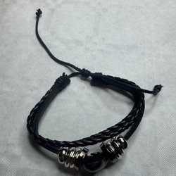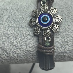 Armband med ett dekorativt öga i mitten. Armbandet har ett flätat band och justerbar knäppning.