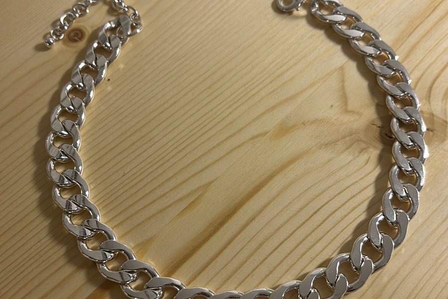 Silverfärgat halsband med grova länkar och justerbar längd.