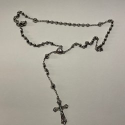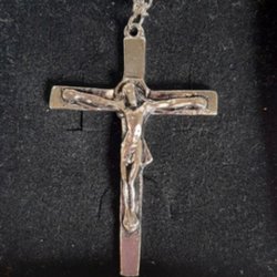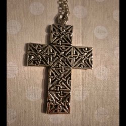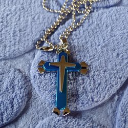Halsband med kors i stål i begagnat skick.