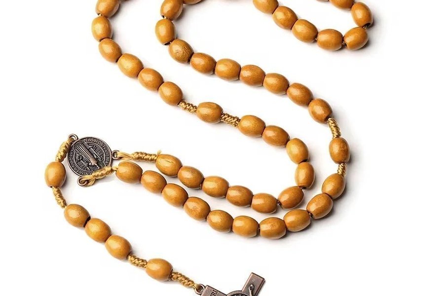 Ett fint radband i trä med korset i metal
