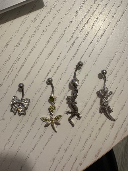 Säljer ett set med fyra olika navelpiercingar. Inkluderar en med rosett, en med trollslända och två med ödlor. Ena ödlan har tappat en ”fot” se bild.