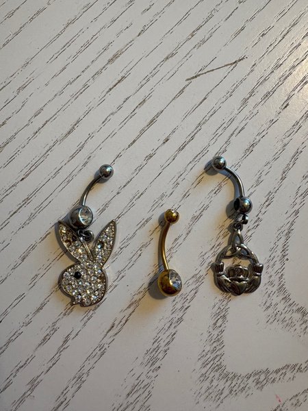 Tre navelpiercingar i olika utföranden. En med en playboy kanin, en i guld med en sten och en med en irländsk symbol.