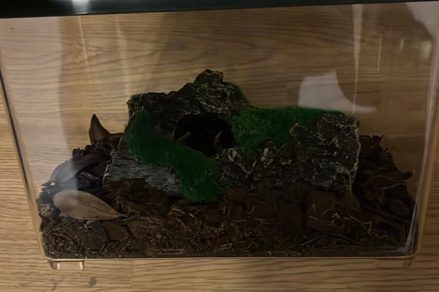 Litet terrarium längd 23cm bredd 15cm höjd 17cm. Kan säljas rengjord med eller utan dekor