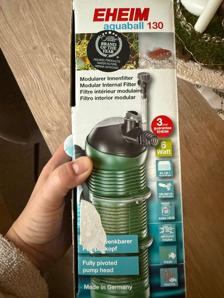Eheim Aquaball 130 modulärt innerfilter. Passar för både söt- och saltvattenakvarium. Har en kapacitet på 60-130 liter (16-34 US gal) och en pumphastighet på 180-550 l/h (48-145 US gal/h). Har ett "easy click" system och ett fullt vridbart pumphuvud. Tillverkad i Tyskland.
