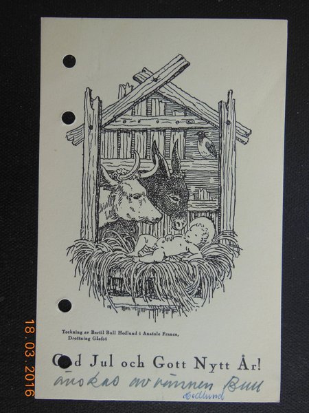 Ett julkort med en teckning av en julkrubba. Teckningen är gjord av Bertil Bull Hedlund i Anatole France, Drottning Gåsfot. God Jul och Gott Nytt År!