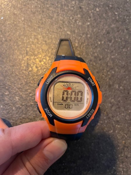 Orange digital ur med forskellige funktioner som alarm og dato. Uret har en sort rem.