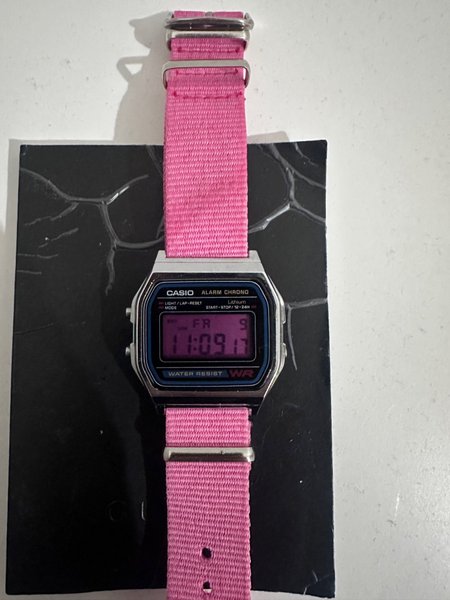 Casio A158 som är modifierad till ett rosa display. Kommer på en rosa natoband. Fungerar utmärkt