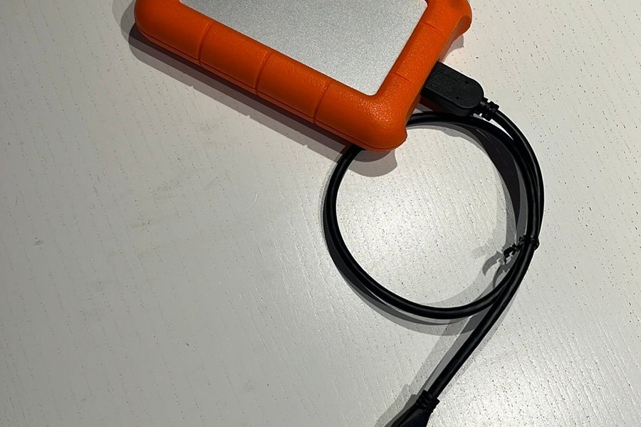 LaCie extern hårddisk med USB-C-anslutning. Robust design i orange och silver.