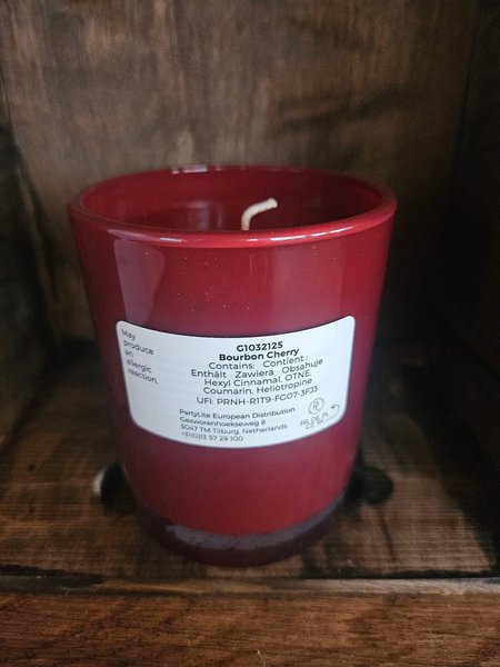 PartyLite doftljus med doften Bourbon Cherry. Innehåller Hexyl Cinnamal, OTNE, Coumarin, Heliotropine. UFI: PRNH-R1T9-FG07-3FJ3. Kan orsaka en allergisk reaktion.
