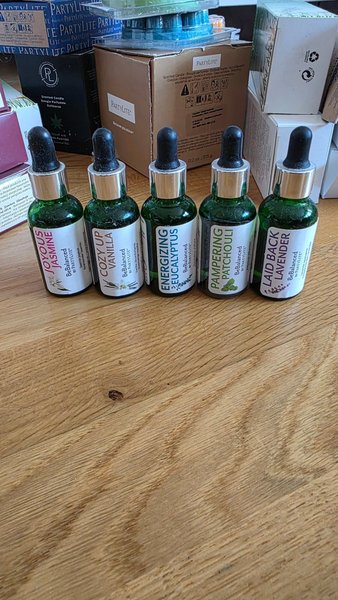 Ett set med PartyLite BeBalanced oljor i dofterna Joyous Jasmine, Cozy Up Vanilla, Energizing Eucalyptus, Pampering Patchouli och Laid Back Lavender.
