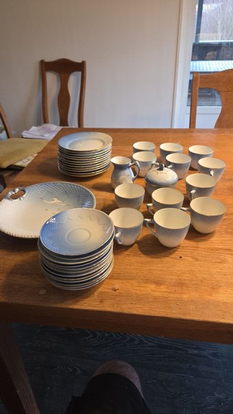 12 koppar med fat och assietter. 1 sockerskål. 1 gräddkanna och ett uppläggningsfat.
