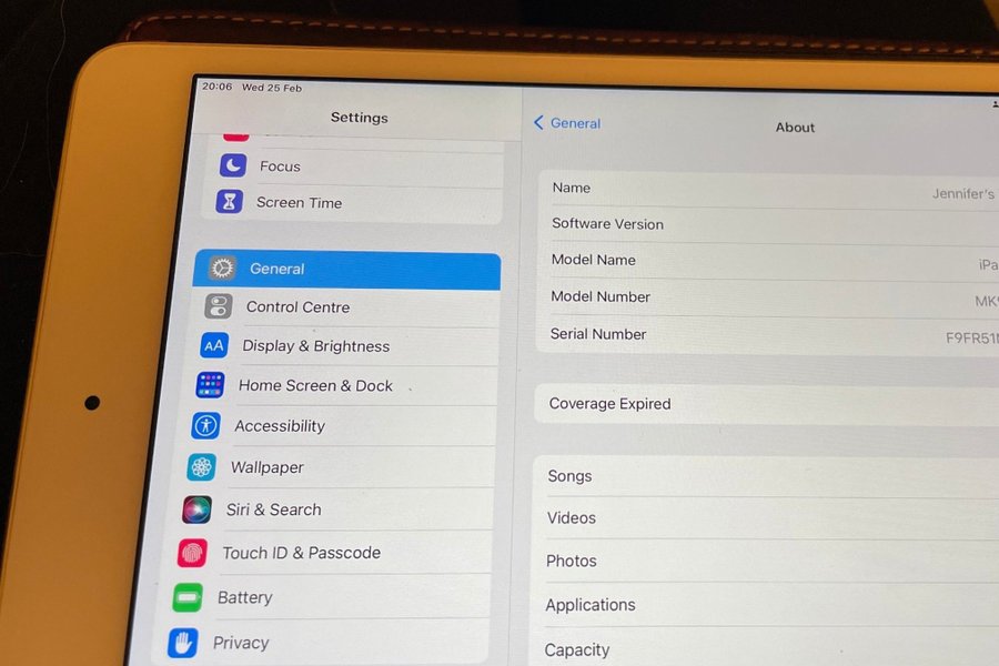 iPad mini 4 med 64 GB lagringskapacitet. Modellnummer MK9J2KN/A och serienummer F9FR51MBGHKH. Operativsystem iOS 15.8.4.