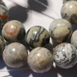 45 styck 8 mm pärlor i fina beige till ljus bruna färgar. Troligen Jaspis