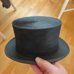 Klassisk svart cylinderhatt med tillhörande hattask. Inuti hatten finns en stämpel med texten "Nils Bergman Hattfabrik Kristianstad".