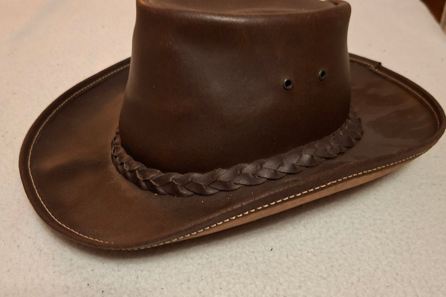 Brun läderhatt med flätat band runt kullen och dekorativa hål på sidan. Innermått 55 cm. Inköpt i Portugal
