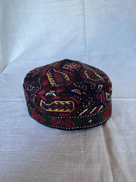 Färgglad hatt med intrikata mönster i olika färger som rött, gult, grönt och blått. Hatten har en rundad form och ett detaljerat band runt kanten.