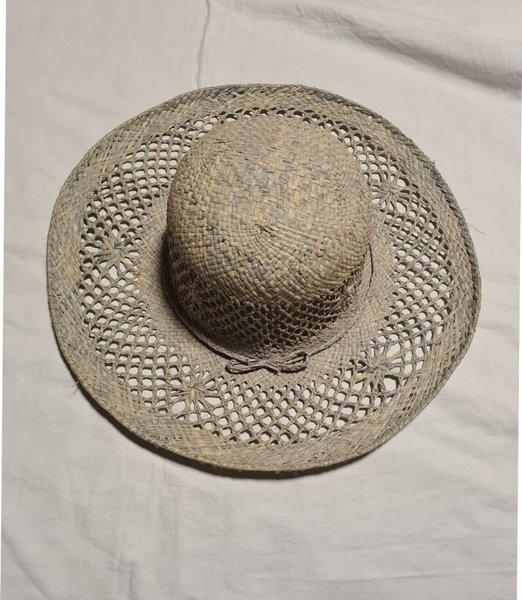 En ljus hatt med ett genombrutet mönster på brättet. Hatten har en klassisk form med en rundad kulle och ett brett brätte.