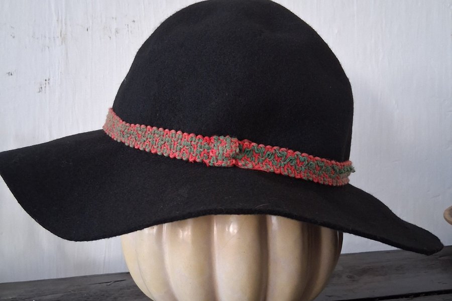 Svart hatt med ett klassiskt band i rött och grönt runt kullen. Brättet är brett och ger en klassisk silhuett. Storlek 5