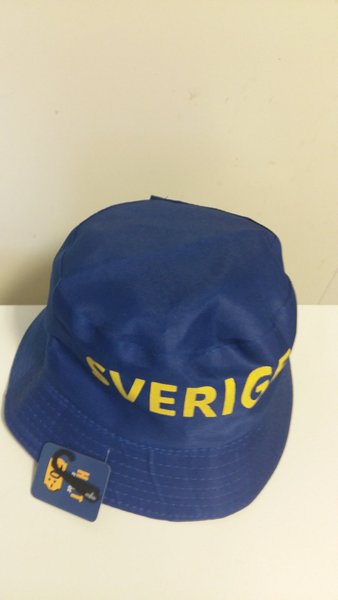 En blå solhatt med texten "SVERIGE" i gult runt kanten. Hatten har en klassisk bucket hat-form med en mjuk, nedåtsluttande brätte.