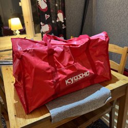 Röd Kyosho väska från 80-90 talet, för förvaring och transport av radiostyrda modeller. Väskan har bärhandtag och plats för tillbehör. Fint skick