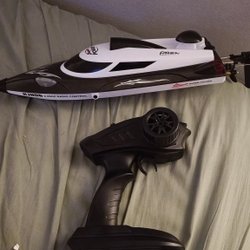 Säljer en borstlös radiostyrd båt.Vattenkyld motor,komplett förutom laddare.Startar och går.Litet lagat hål på undersidan,se sista bild.