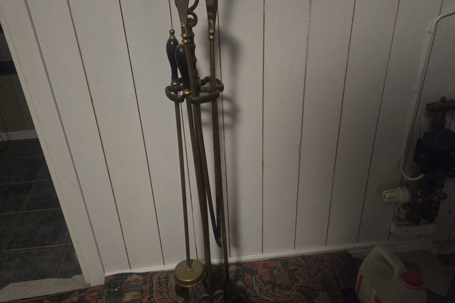 Ett elegant eldställ i mässing med tillhörande verktyg. Perfekt för att hålla ordning vid öppna spisen eller kaminen.