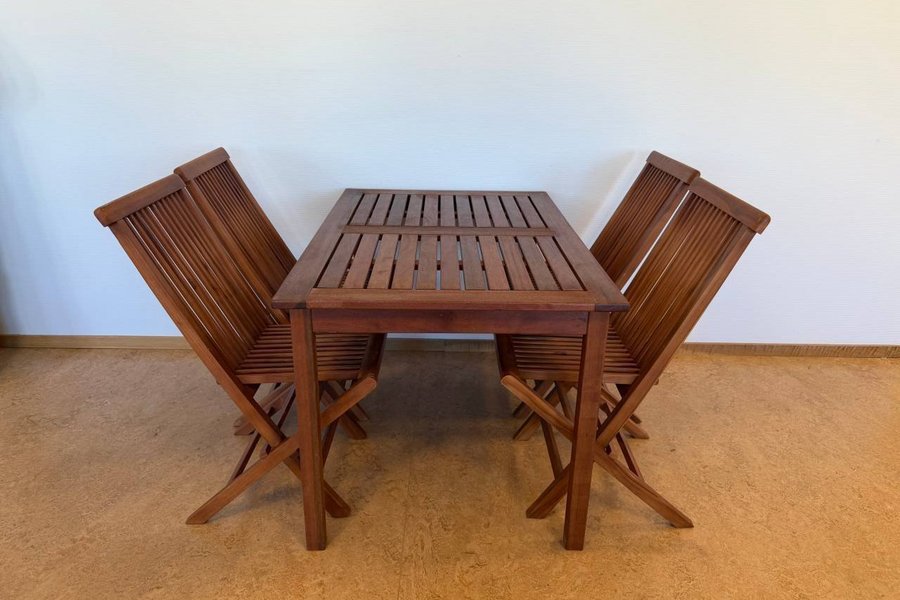 Utemöbler i trä. Bord och stolar med ribbad design. Stolarna är fällbara.
