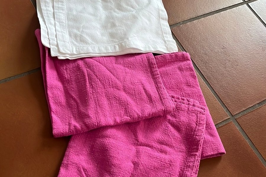 Servetter i rosa och vitt. 5 stycken mindre i vitt varav en har en kaffefläck. 3 rosa av märket Sia.