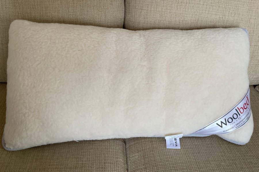 En mjuk kudde från Woolbed, 50x60 cm, Kashmir/Merinolammull/Silke, made in Germany. Kan tvättas 30 gr.