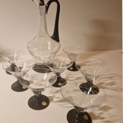Säljer ett elegant vintage likör-/cocktailset i tunt glas med en vackert formad karaff och 14 matchande glas. Setet har en klassisk och tidlös design som passar perfekt för servering av cocktails, likör eller dessertvin. Glasen har en lätt ton och en stilfull fot. Karaffen har en elegant form med en spetsig stopper. Perfekt för samlare eller för dig som uppskattar vackert glas.