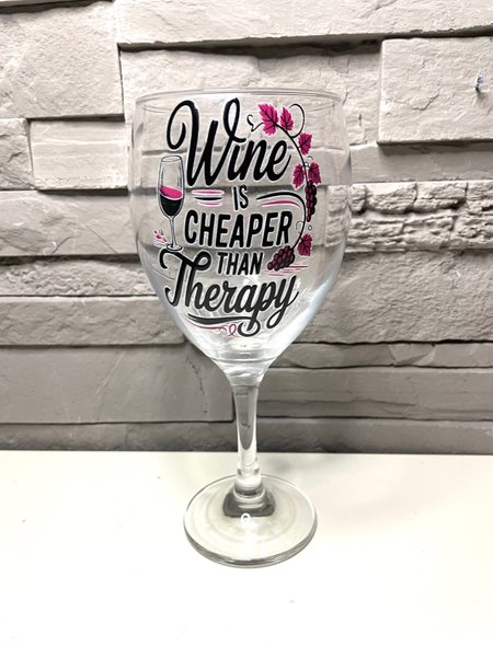 Stort Vinglas med texten "Wine is cheaper than therapy".