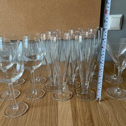 Glas med dekor. Dessa glas är i kristall och det är 8 st stora höjd 16 cm bredd 8,5 cm och 6 snaps glas kan finnas nagg